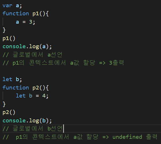 하지만 let의 경우엔 p2블록만 스코프로 갖게 되므로 let b; 만 반영하여 undefined이 출력 될 것이고