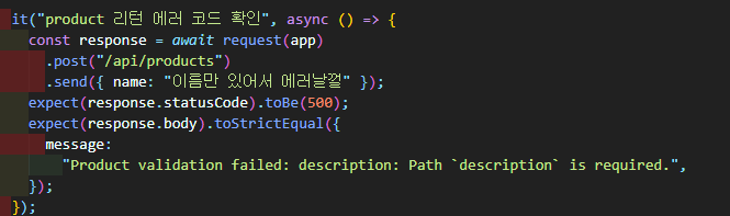 다만 supertest에서 불러온 request 메소드를 이용하여 app객체를 전달한다.