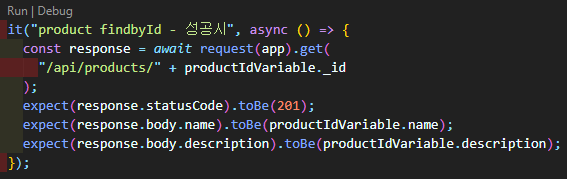 또한 다음 테스트를 위해 productIdVariable을 만들어 findbyid요청을 테스트해보겠다.