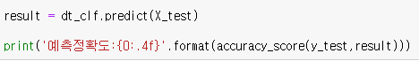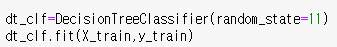 Step1에서 불러왔던 의사결정트리를 ML알고리즘으로 사용하고, fit메소드를 통해 학습용 feature와 label데이터를 집어 넣어 학습을 한다.
