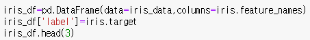 이때 label의 0,1,2는 target_name으로 변환하면 각 setosa, versicolor, virginica 세가지 라벨을 뜻한다.