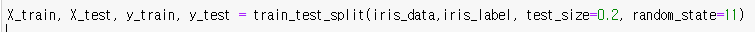 해당 코드는 X는 feature 데이터, y는 label을 각각 테스트, 학습용으로 나누어 추출한다.