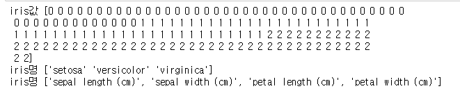 또한 target메소드는 label데이터를 numpy로 보여주며, feature 리스트는 feature_names로 뽑아낼 수 있다.