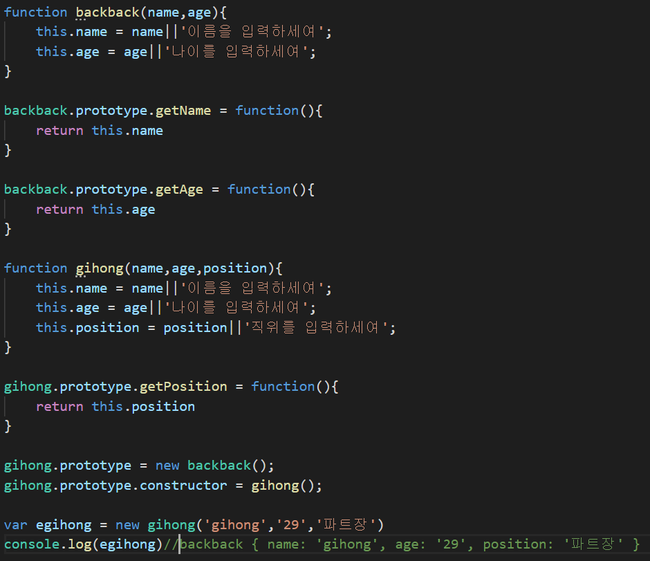 이 과정에서 일단 gihong의 protoType이 backback 생성자 함수의 인스턴스가 되었으므로