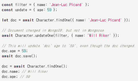 - findOneAndUpdate는 index가 없는 upsert를 제외하곤 atomic 속성을 유지해준다. 예컨데 save만 사용하는 경우 atomic이 유지되지 않아 문제발생이 가능하지만, findOneAndUpdate는 그렇지 않다