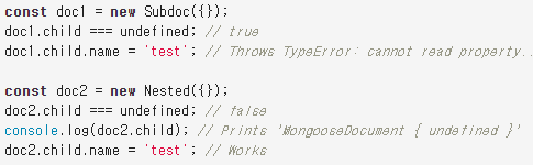 - Nested path로 객체를 직접 설정하는 방식과 Subdocument를 설정하는 방식의 차이가 있다. 첫째로 Nested한 방식으로 생성한 스키마는 child 객체를 갖지만, subdocument는 갖지 않는다. 실제 Document를 overwrite 하는 경우에도 nested한 방식으로 생성된 스키마는 기존 내용을 건들지 않고 추가되지만, subdocument는 덮어쓴다.