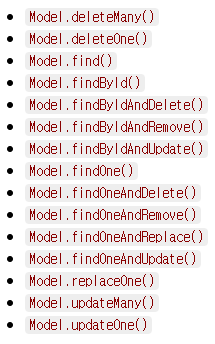 - Model 역시 기본적으로 Document 클래스에 해당된다. 몽구스의 특정 메소드로 쿼리를 처리하고 난 후에도 Document 자료형이 반환된다.