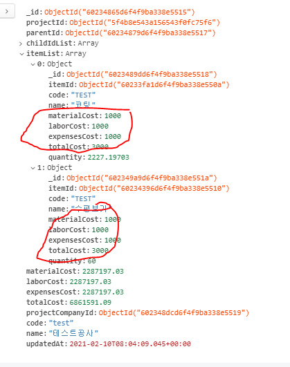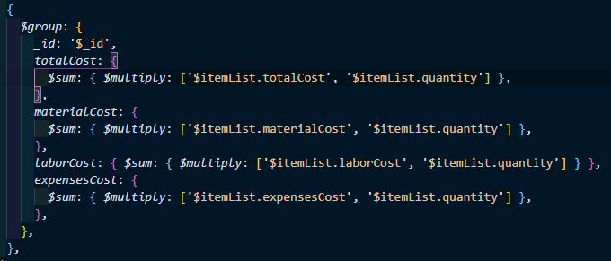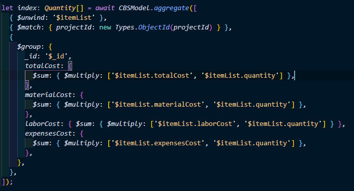해당 로직은 nested한 document 배열의 cost값들을 읽어 quantity를 곱한 후, 이를 모든 원소에 대해 수행하여 총합을 더해주는 로직이다.