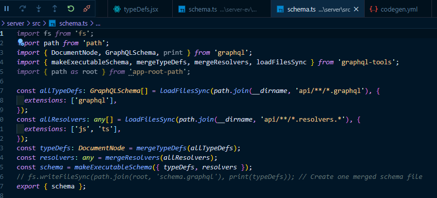 실제로 code generator를 사용하기 전에는 아폴로가 제공하는 makeExecutableSchema를 통해 typeDefs와 resolvers를 만들어줬다.