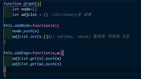 - addNode: 특정 node v를 node 배열에 넣고, adjList에는 'v' =[ ] 라는 원소를 만들어준다