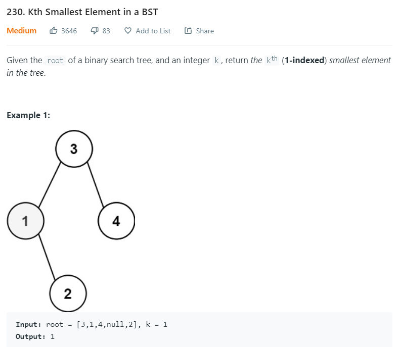 Tree와 index k 가 주어졌을때 k번째로 작은 node는 무엇인지 구하라는 문제