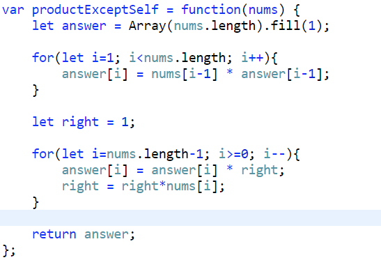 첫번째 for문은 각 항목에 연쇄적으로 이전 배열 원소를 곱해주도록 만든다.