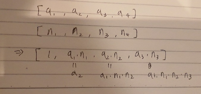 이때 Answer의 원소는 모두 1이므로, 최종적으로 [ 1, n1, n1*n2, n1*n2*n3 ]의 배열이 만들어진다.