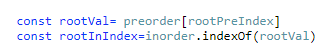 1) preorder에서 root 노드를 찾는다. preorder는 항상 0번째 노드가 전체 트리의 root 노드이다. 또한 이 값은 rootVal에 저장한다.