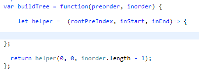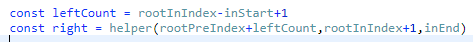 helper라는 함수를 이용하여 재귀처리 하려고 한다. 이때 사용되는 args는 rootPreIndex, inStart, inEnd이다.
