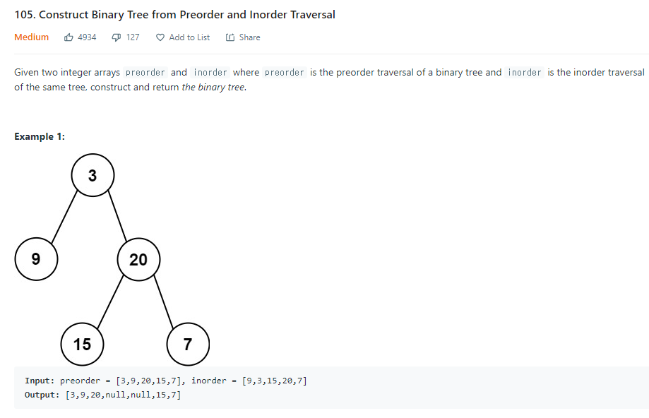 이를 inorder에 적용하면 3을 기준으로 9가 left node, 15,20,7은 right node라는 것을 알 수 있다.