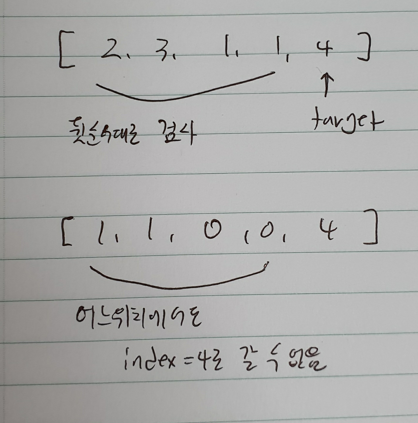 만약 [3,3,1,0,4] 라면 true일 것이다. index=1의 위치에서 index=4로 갈 수 있기 때문이다.