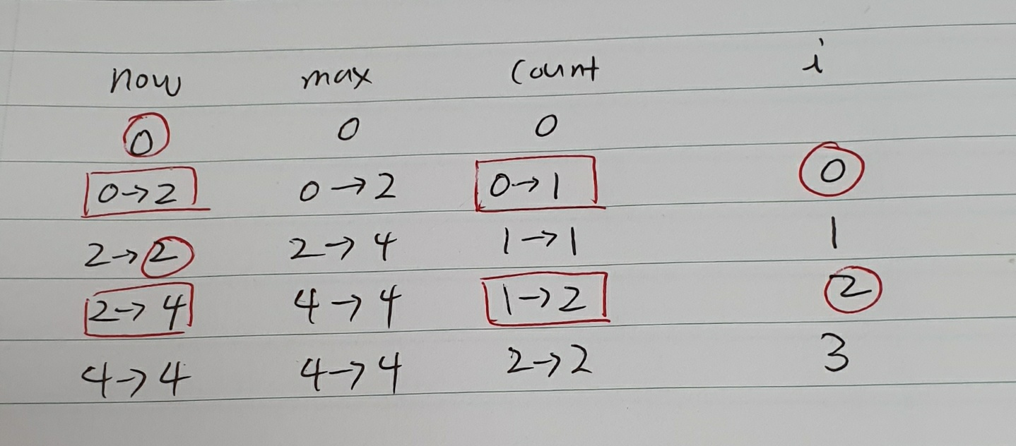 index=0에서 시작하니 count가 하나 올라가고 max가 변경된다.