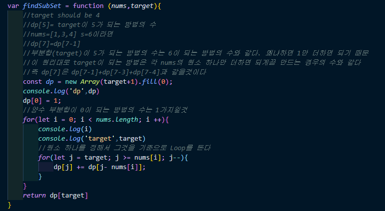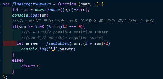 이후 findSubSet이라는 함수를 만들어 nums와 target을 넘겨준다