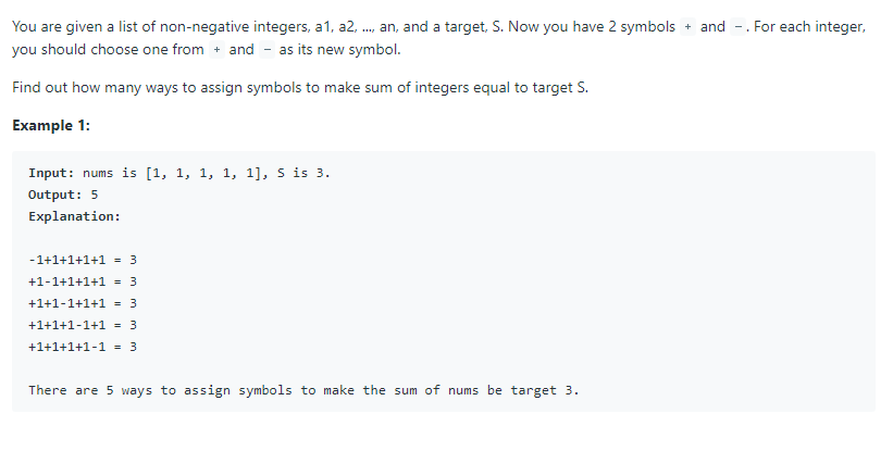 양의 정수들로 이루어진 배열이 주어질 때 + 와 - 를 적절히 사용해서 특정 합 S 를 만들 수 있는 경우의 수를 찾는 문제