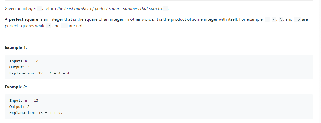 perfect squeres는 결국 제곱수를 말하는데 가장 적게 쪼갤 수 있는 제곱수 경우의 수를 구하라는 문제이다