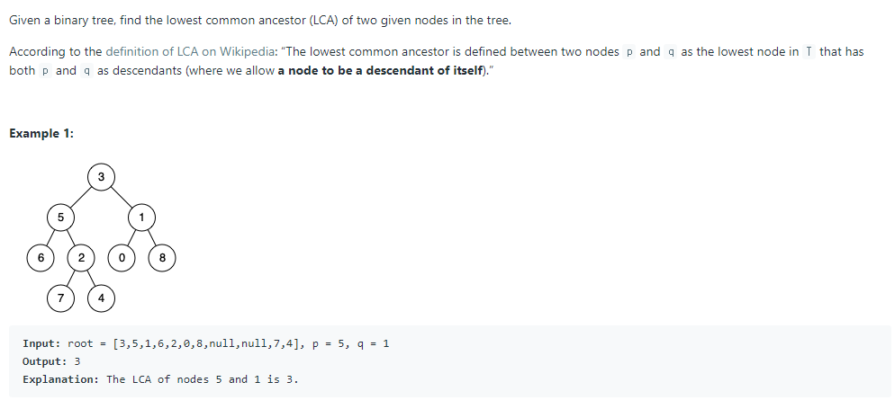 LCA는 Lowest Common Ancestor인 노드를 뜻한다. input으로는 조건이 되는 두개의 노드와 함께 트리가 들어온다.