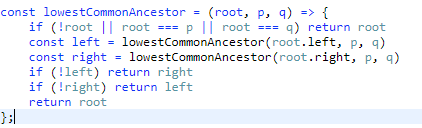 최종적으로 left에 p,q가 없다면 right를, right에 없다면 left를 리턴해주고, 둘 다 있다면 다시 root를 리턴해주면 된다.