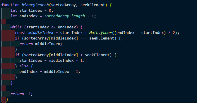 이 loop는 middle index를 구하고 target이 있다면 해당 값을 리턴하고, target이 더 크다면 startIndex를 우측 반으로, 더 작다면 endIndex를 좌측 반으로 설정한다.
