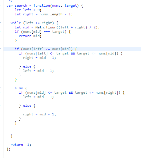 이때 nums[left] <= nums[mid]의 조건은 좌측이 오름차순으로 정렬되어 있음을 뜻한다.