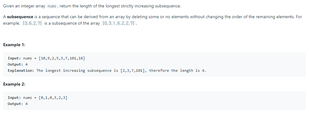 예를들어 i가 4인경우, 실제 longest Increasing Subsquence는 1-3-6-7-9가 되지만, dp[i]는 4를 포함해야하므로 1-3-4가 최댓값일것이기 때문이다. 따라서 이 경우는 3이 된다.