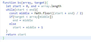 이 binary search는 일반적인 이진탐색과 달리 target을 middle에서 찾지 않고 조건에 따라 start를 리턴한다