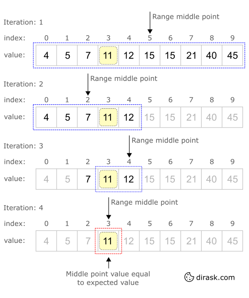 left, right를 정해주고 Loop안에서 middle point를 지속적으로 바꿔주며 target을 찾는다
