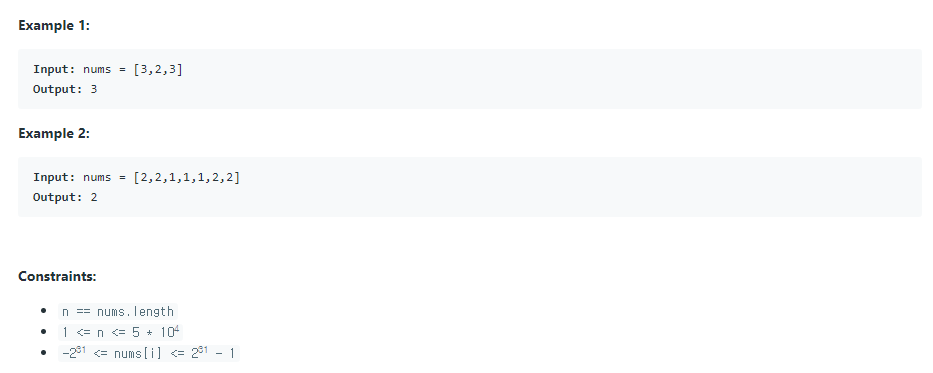 The majority element is the element that appears more than ⌊n / 2⌋ times. You may assume that the majority element always exists in the array.