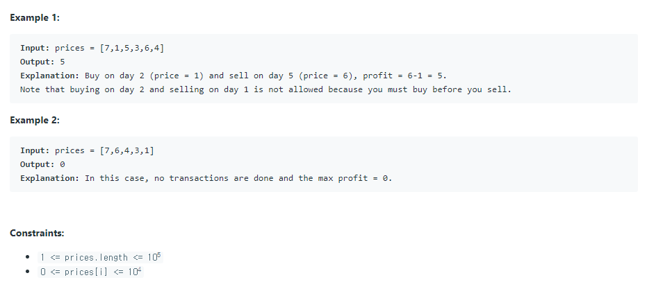You want to maximize your profit by choosing a single day to buy one stock and choosing a different day in the future to sell that stock.